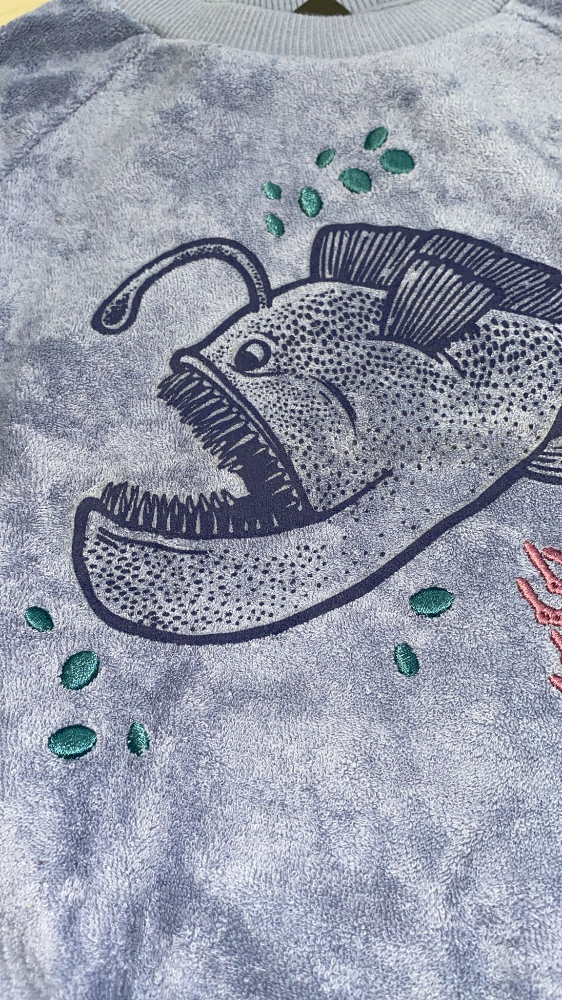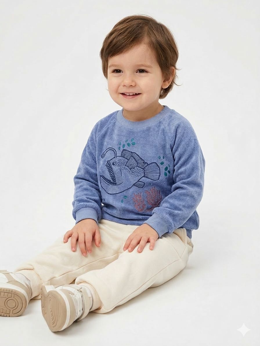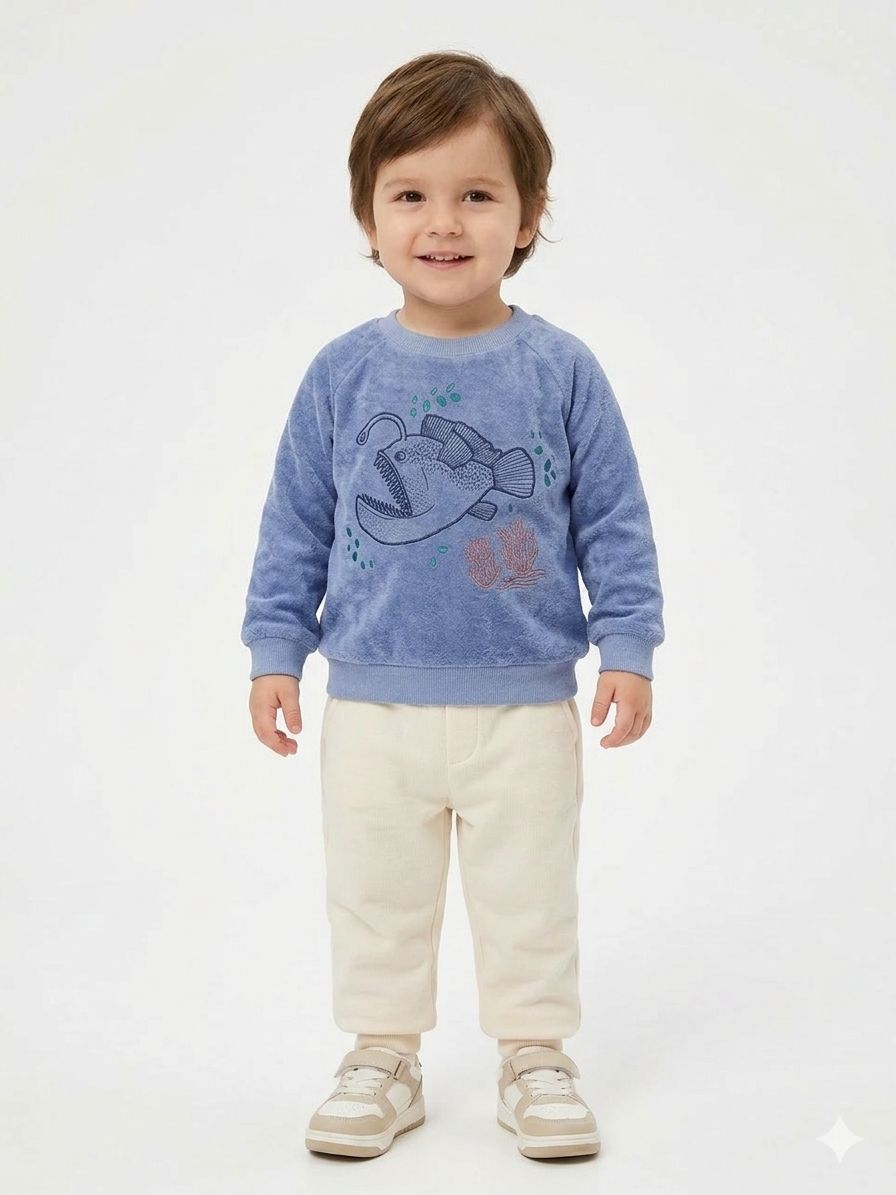 Buzo infantil 100% algodón con textura aterciopelada, suave y abrigado. Presenta cuello redondo, puños elastizados y divertido estampado de pez en el frente. Ideal para un look cómodo y canchero. 🐟✨