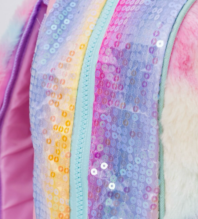 • Materiales: Confeccionada en plush, holo rosa PU, lentejuelas, poliéster 600D y PVC, asegurando durabilidad y un toque de magia.